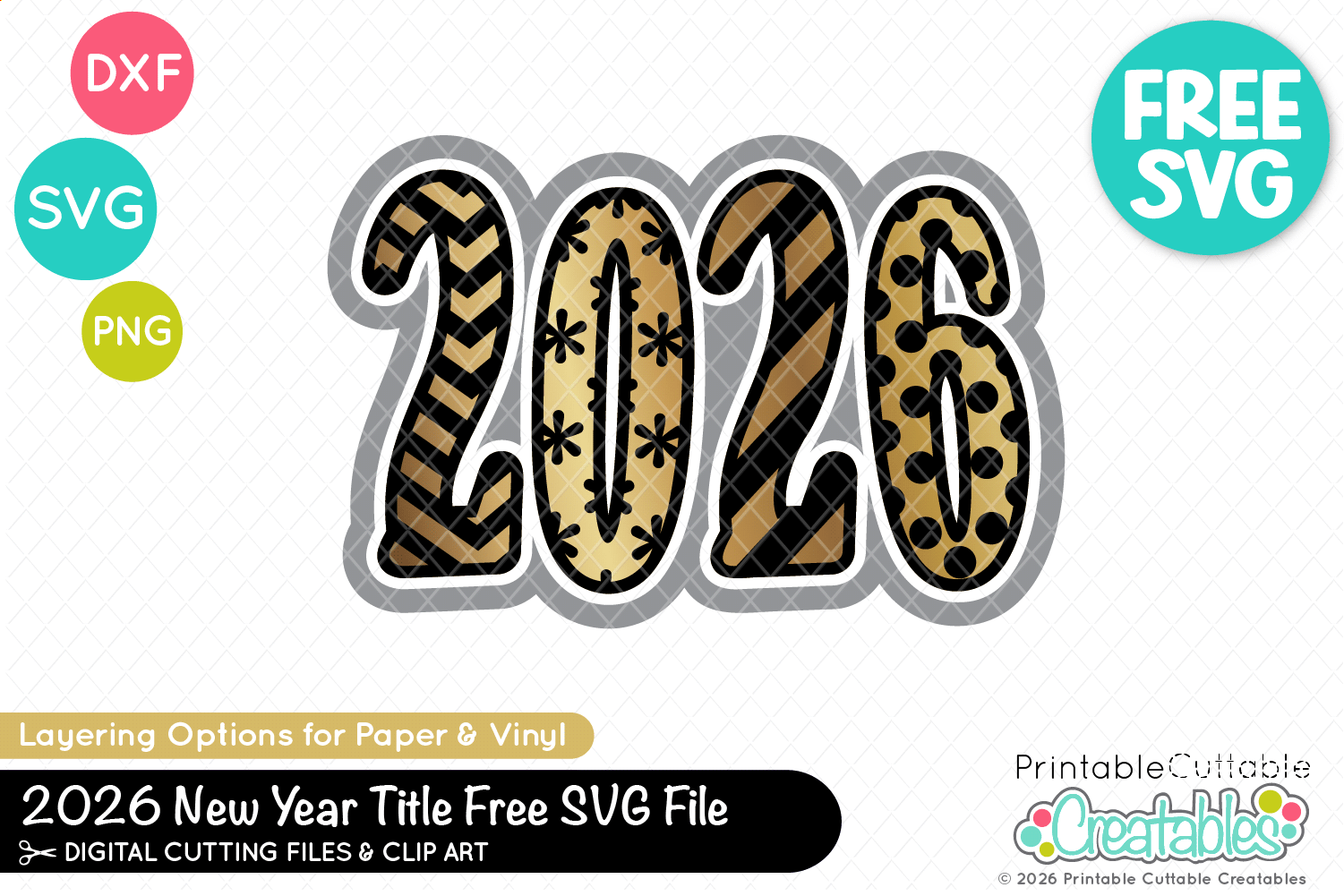 2026 New Year Title Free SVG File includes a variety of options, so whether you’re paper crafting or working with vinyl & HTV, you’ll have what you need!